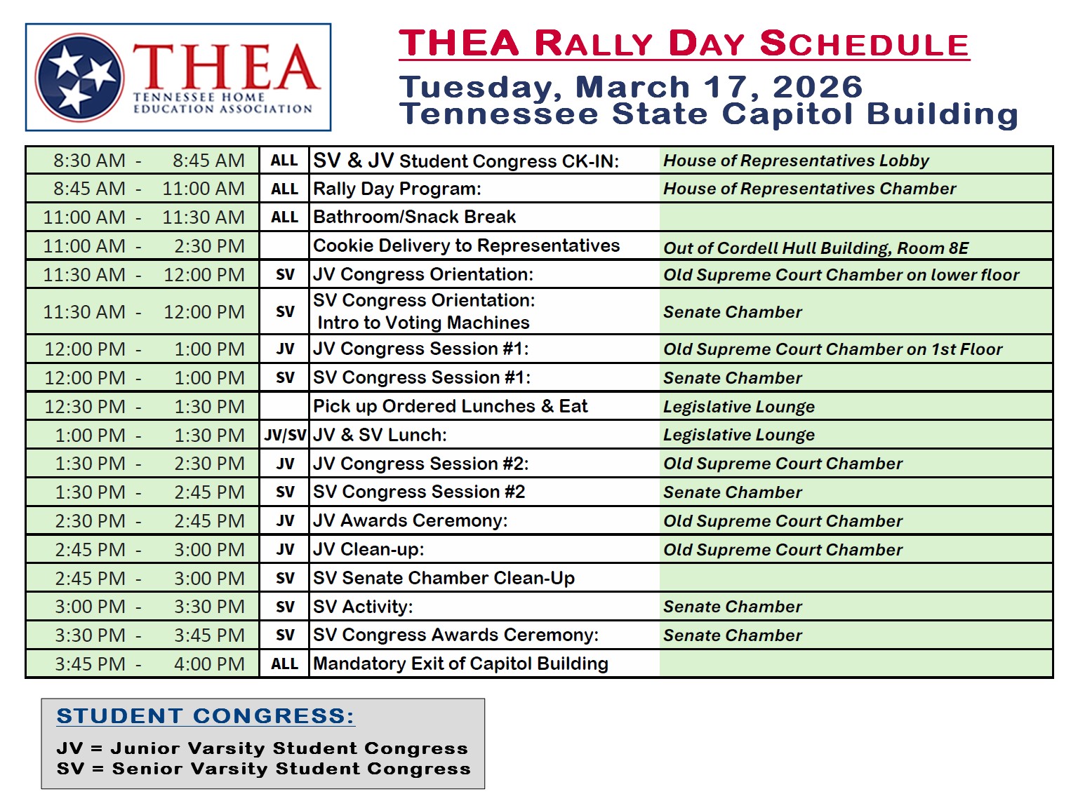 If you have a display to bring to the Rally Day Legislator’s Luncheon Reception, call THEA’s Display Organizer, Pam Archer at 615-516-6157. If you miss her, leave a message with your contact information, your request for display space, & whether you need a 3’ or 6’ space. She will contact you! The table spaces are first come, first served, so don’t hesitate! THEA reserves the tables for you & provides the tablecloth! You supply the display!